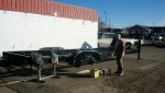 I finally decided that a trailer around 28′ long with a gooseneck would probably do for my purpose. I located a trailer company in Denver, Jayhawk Trailers. I called there a few times with a bunch of questions and spoke with Aaron, the owner. He was a huge help in figuring out what would be best. His wife Shannon is in the one photo in the previous post, doing all the paper work. I had him looking out for the right trailer for me and when I visited the first time (with my sister who took the photo of me sitting on the trailer) I saw this trailer and everything began to fall into place.